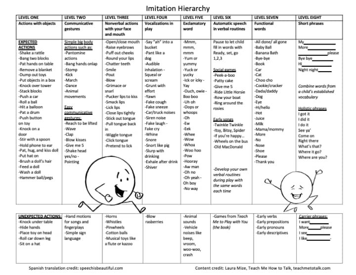 Hi everyone, Back 18 months ago....one of you fabulous people named Mary reached out to me and asked me to create a Spanish version of the Imitation Hierarchy by Laura Mize. The Imitation Hierarchy is something that I think a lot of SLPs know on a gut level, but back before I wasn't aware of a formal hierarchy. It is part of the 180 page Building Verbal Imitation Skills in Toddlers program that Laura Mize has created on her website. She is a legend and a tremendous resource who has a ton of useful products including low cost ASHA CEUs too. I went ahead and worked with a professional translator to collaborate on creating something that would be beneficial for both SLPs and parents. By creating this resource, I am absolutely not trying to step on anyone's toes and also I am not sponsored by Laura Mize or her Teach Me to Talk website. This is a freebie and I am not charging for it and I'm making no money from it. In fact, I paid a professional translator to collaborate with me to make sure what I create is right. CLICK HERE for the PDF: IMITATION HIERARCHY The first page is the original content in English and the second page is the same (or very close) in Spanish. You can't always directly translate in Spanish so you choose words that mean the same conceptually. I just wanted to get this out in the world in Spanish because I think it will help bilingual families and bilingual SLPs! Going back to the Imitation Hierarchy, it describes non-verbal communicative behaviors that are the building blocks to communication. It offers suggestions on how to increase those behaviors and also some early speech too. Thanks Mary for the request for a Spanish copy. Feel free to ask me to create something for you - I'm open to suggestions any time! Have an awesome week, everyone! All the best, Sarah 💘